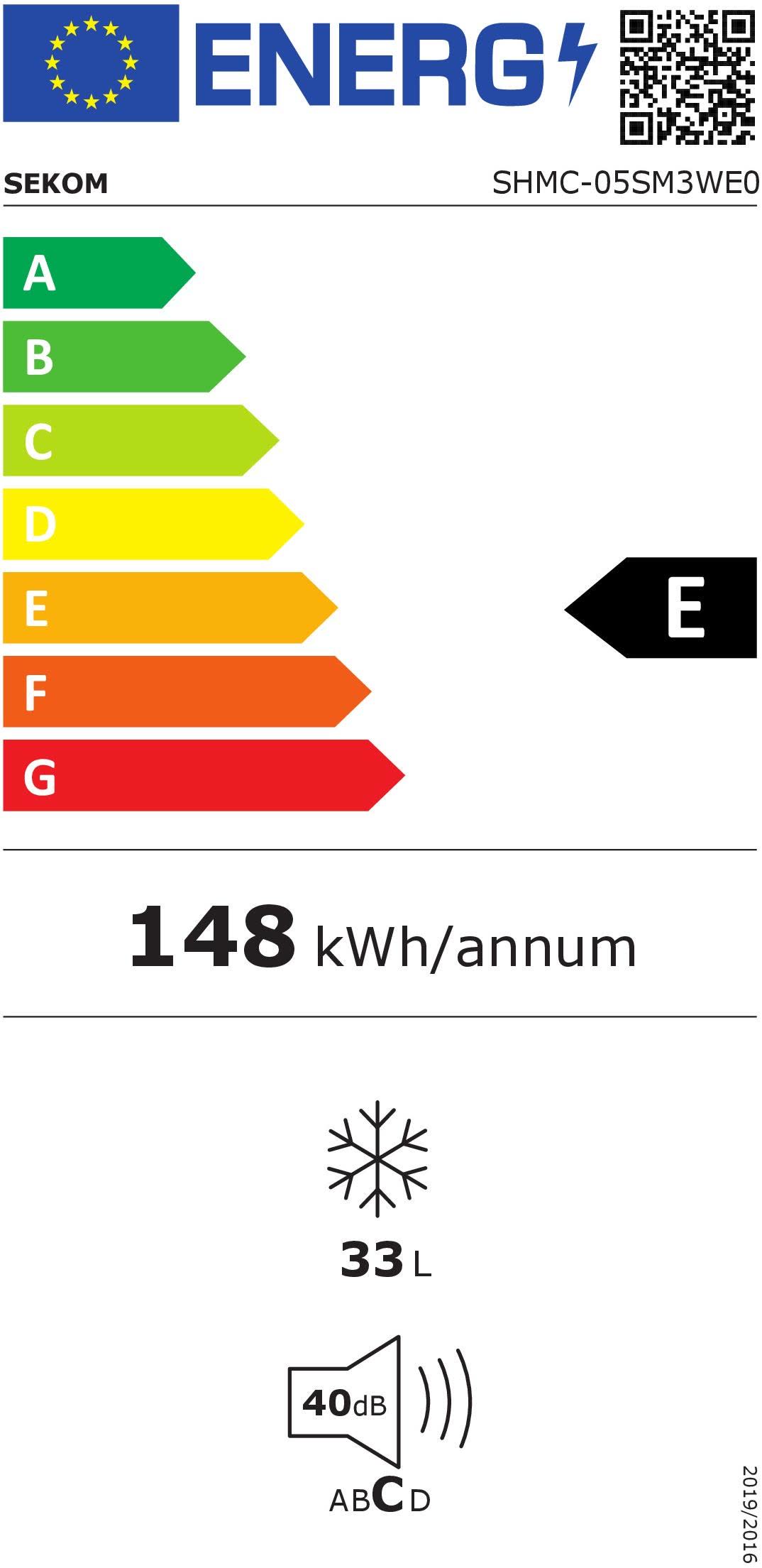 Sekom SHMC05SM3WE0. Capacità netta congelatore: 33 L, Classe climatica: N-ST, Capacità di congelamento: 2 kg/24h, Autonomia senza energia elettrica: 14 h, Emissione acustica: 40 dB. Classe efficienza energetica: E, Consumo energetico annuo: 148 kWh. Colore del prodotto: Bianco