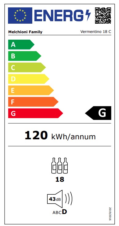 G, 18 bottiglie / 50 litri, 120 kWh/a, 43 dB, Luce interna a LED , 70W, Nero